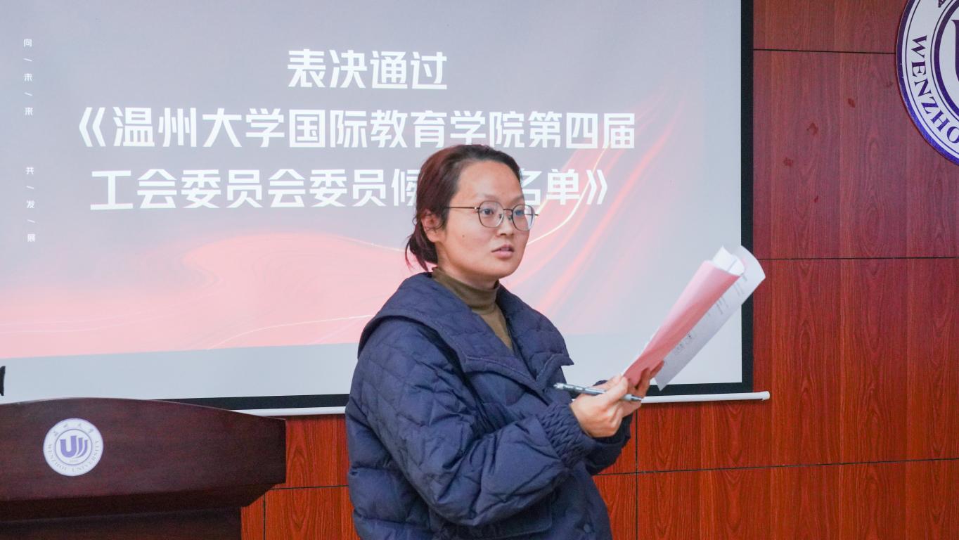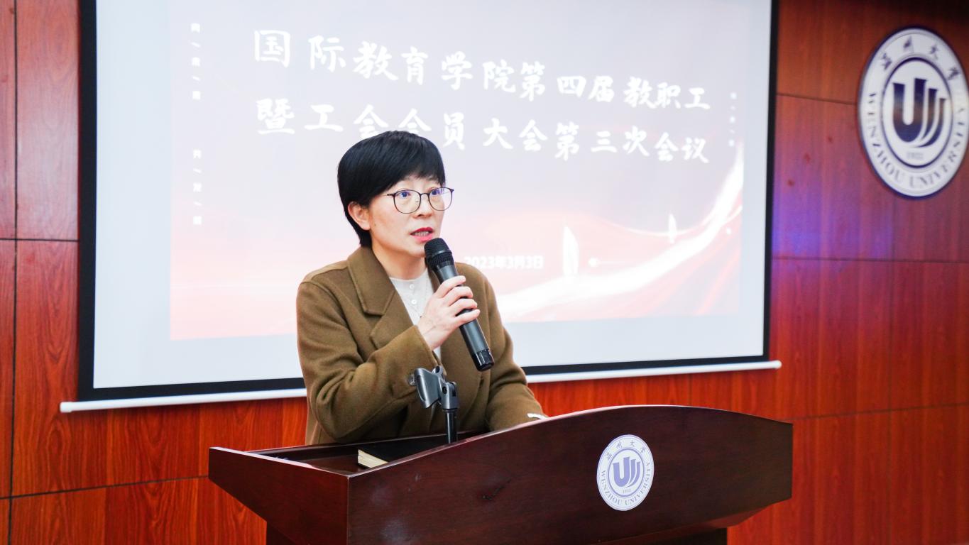 会议在庄严的国歌声中拉开序幕。学院院长宋占美作《学院工作报告》、《学院年度财务决算报告》,对2022年学院工作进行总结,2023年学院工作进行展望。宋占美院长指出,2022年,学院在提高政治站位,履行重大使命;聚焦更高水平,开创重大成就;筑牢留管特色,频发温大好声音;勇于求进作为,提升国际影响力等方面取得了重大发展。2023年,学院将进一步凝聚特色,逐创品牌,努力做到规范管理,内涵发展,进一步夯实“留学温大”工程。学院工会主席林爱菊作《工会工作报告》。
