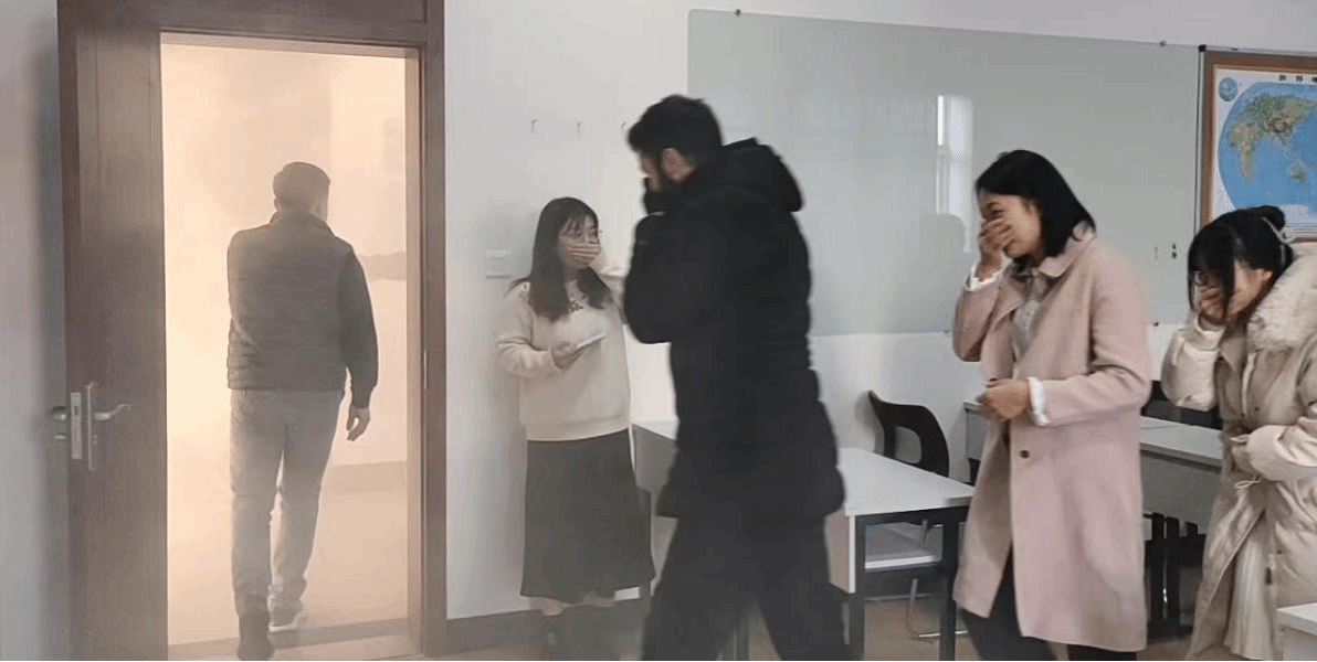 随着警报声响起,消防演练正式开始。大家立即停下手中的工作和学习,按照平时演练的步骤和路线,沿着逃生通道迅速而有序地撤离。在逃生过程中,师生们捂住口鼻,沿着墙角弯腰快步前进,安全有序地撤离到指定区域。整个过程紧张而有序,没有出现慌乱和拥挤的情况。