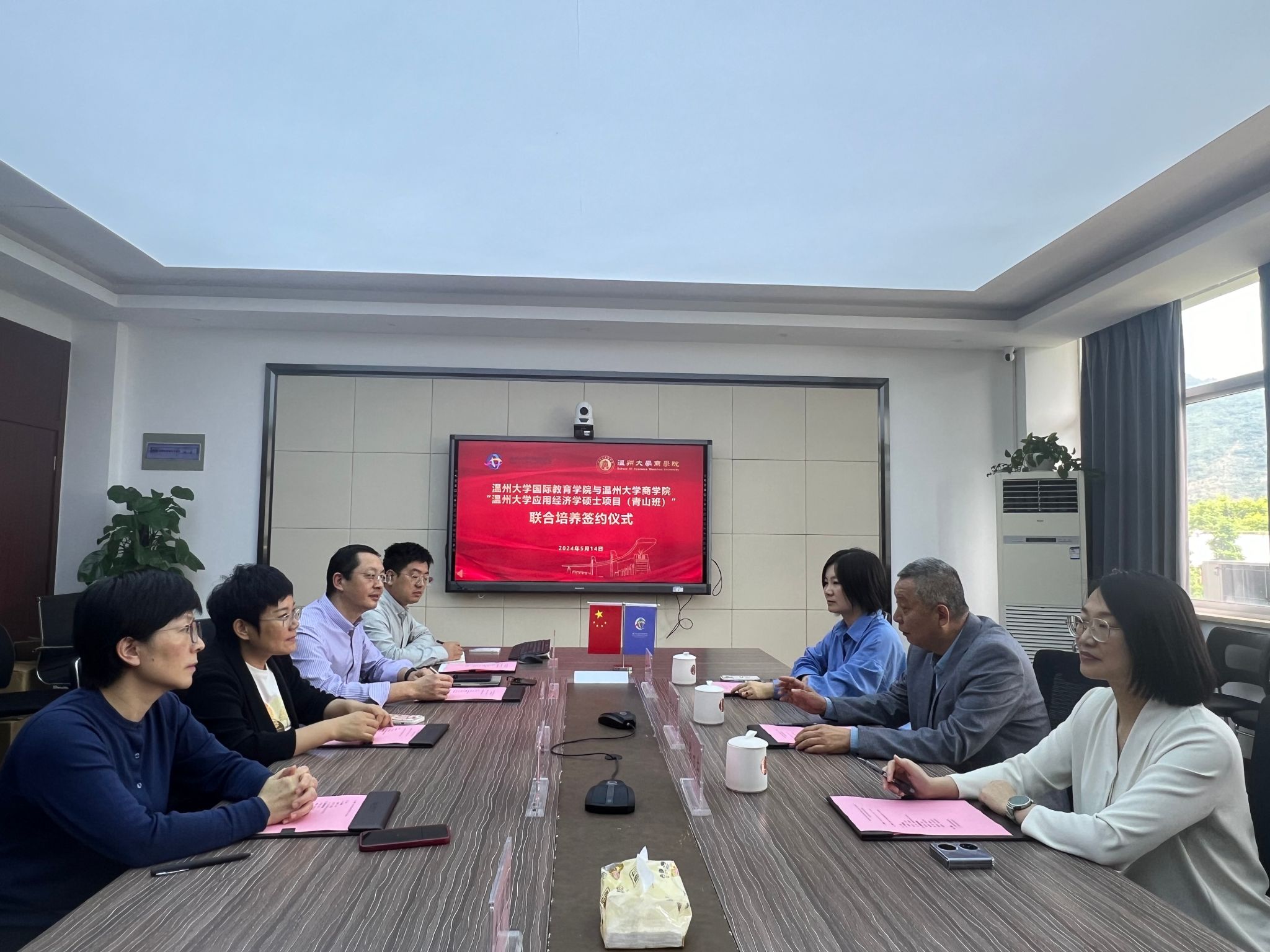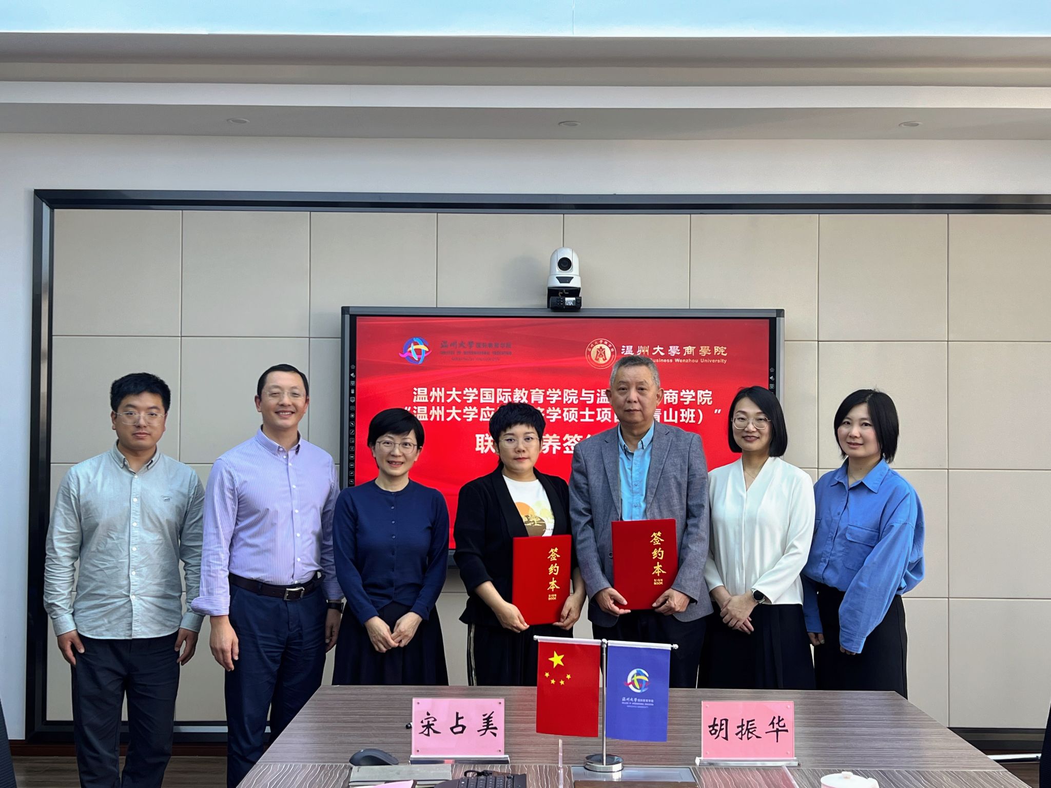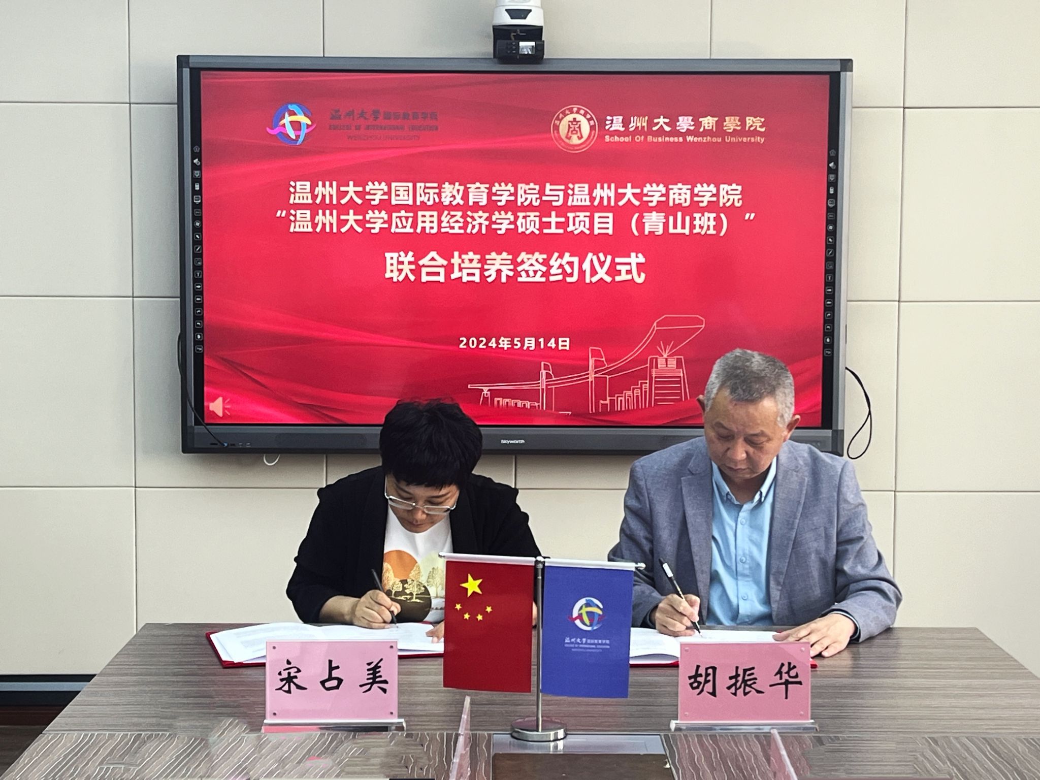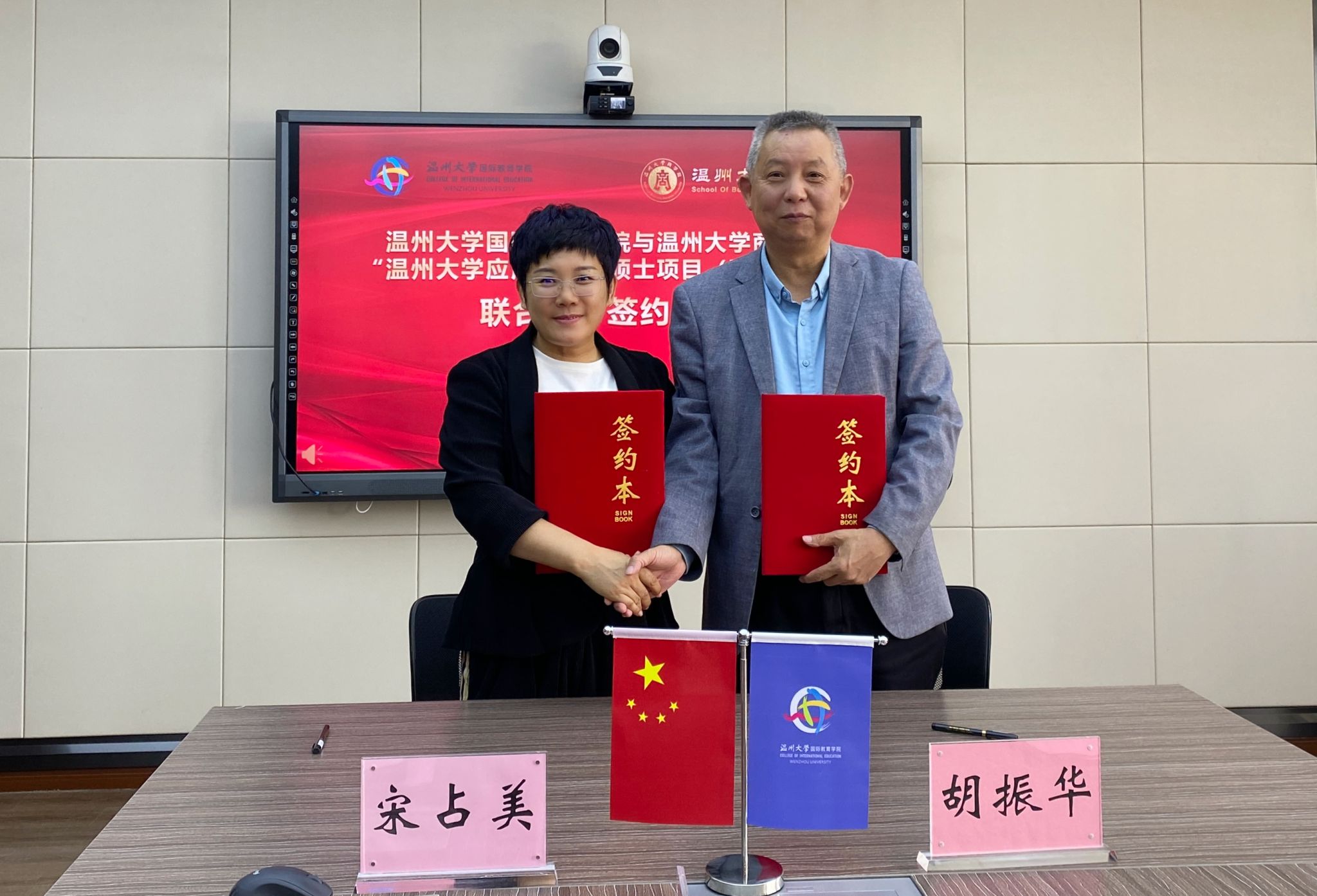 应用经济学硕士项目(青山班)”联合培养项目签约仪式。参加活动的有商学院院长胡振华、副院长陈文芝与商学院国际学生硕士点负责人王露。国际学院院长宋占美、党总支书记林爱菊、副院长熊勇以及相关科室负责人参加此次签约仪式。