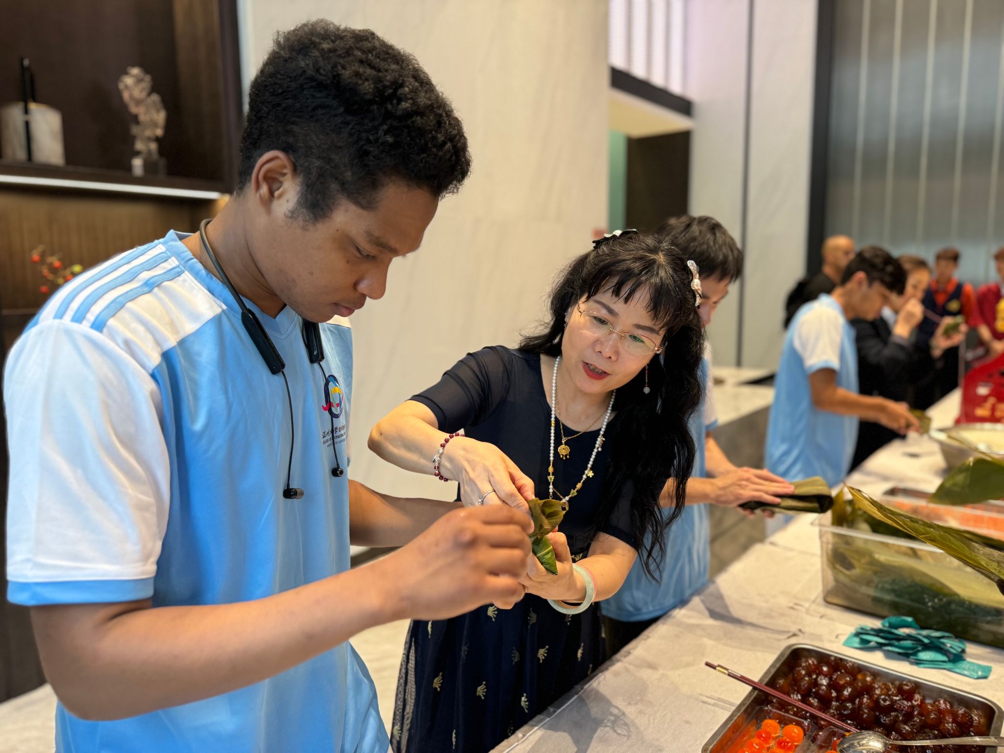 龙舟是中华传统文化瑰宝,温州更是中国龙舟文化之乡。在龙舟竞渡之余,留学生们还参观了温州龙舟文化博物馆,一幅幅生动的图片、一件件精美的龙舟模型,从龙舟的起源传说到历代的发展演变,从制作工艺的精湛到龙舟赛事的激烈,留学生们仿佛穿越时空,领略到了这一古老文化的博大精深,他们纷纷驻足观看,不时发出惊叹之声。随后他们还乘车前往君廷酒店体验包粽子、撞蛋等传统民俗活动,深刻感受着中国传统文化的多元魅力与深厚底蕴。