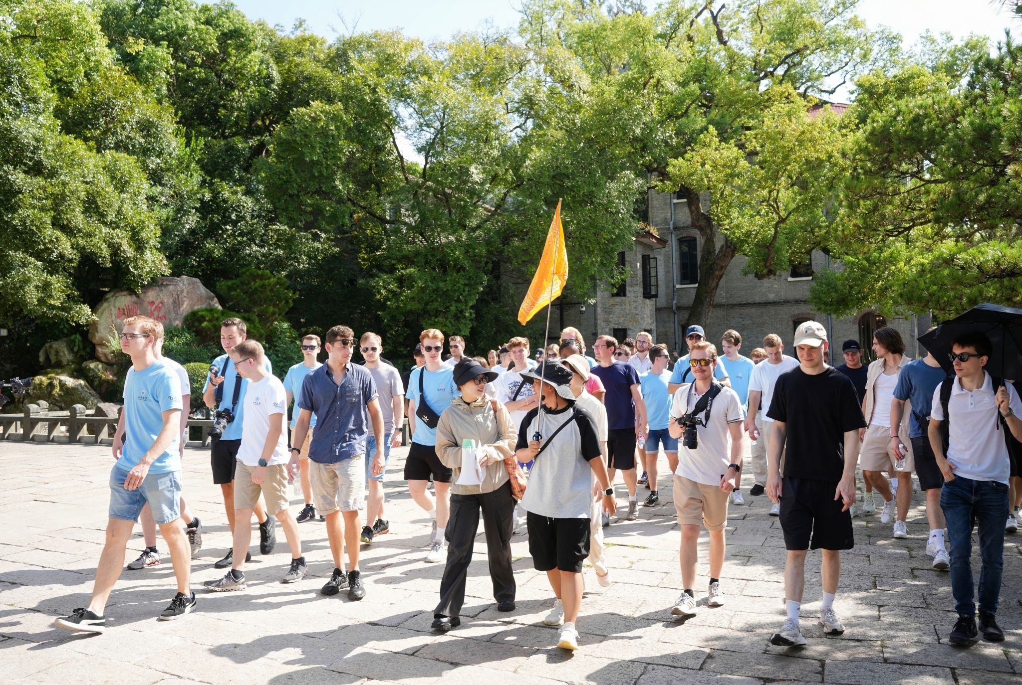 上午第一站是瓯越大地的标志性胜景——江心屿。这座江心小岛犹如一颗绿色的明珠,静静镶嵌在瓯江之中,在讲解员的详细解说下,德国青年学生们漫步于古塔、古寺之间,感受着温州的自然美景与历史文化的沉淀。他们聆听着江心屿的历史故事,仿佛穿越了时空,与古人对话,体验了一次心灵的洗礼。