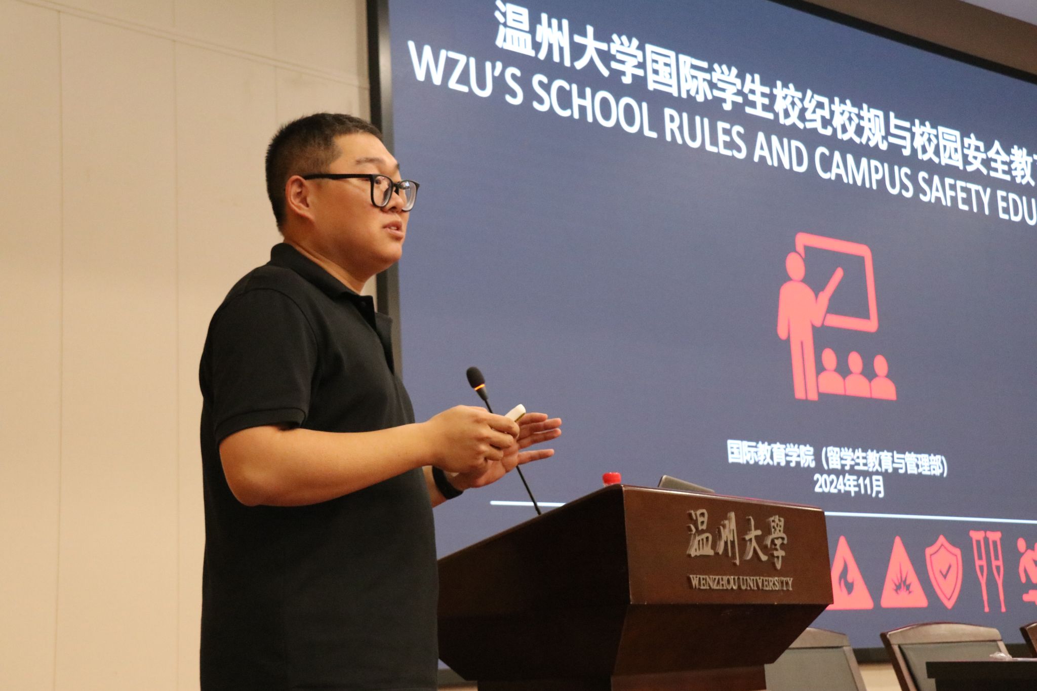 学工办主任刘天详细讲解了校纪校规及校园安全事项。他通过列举因违规用电引发火灾、因门窗未锁导致财物失窃等真实案例,让国际学生们深刻认识到潜在危险,并且进一步针对这些风险隐患,提出了一系列切实可行的预防措施与应对策略,如正确使用电器设备、养成离寝前仔细检查门窗关闭情况的习惯等,以全方位保障学生们在校园中的学习与生活安全,提升他们的自我防范意识与应急处理能力。