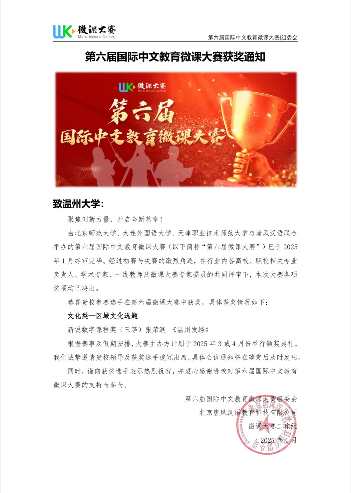 近日,由北京师范大学、大连外国语大学、天津职业技术师范大学与唐风汉语联合主办的第六届国际中文教育微课大赛圆满落幕。本届大赛吸引了来自全国240余位个人选手及120余个团体(含近700名成员)参与,提交作品逾1300件,涵盖语言教学、区域文化、中国国情等多元主题。555电影 2023级研究生张荣润凭借扎实的专业知识、创新的教学理念和出色的教学技能在比赛中荣获“新锐数字课程奖(三等)”。