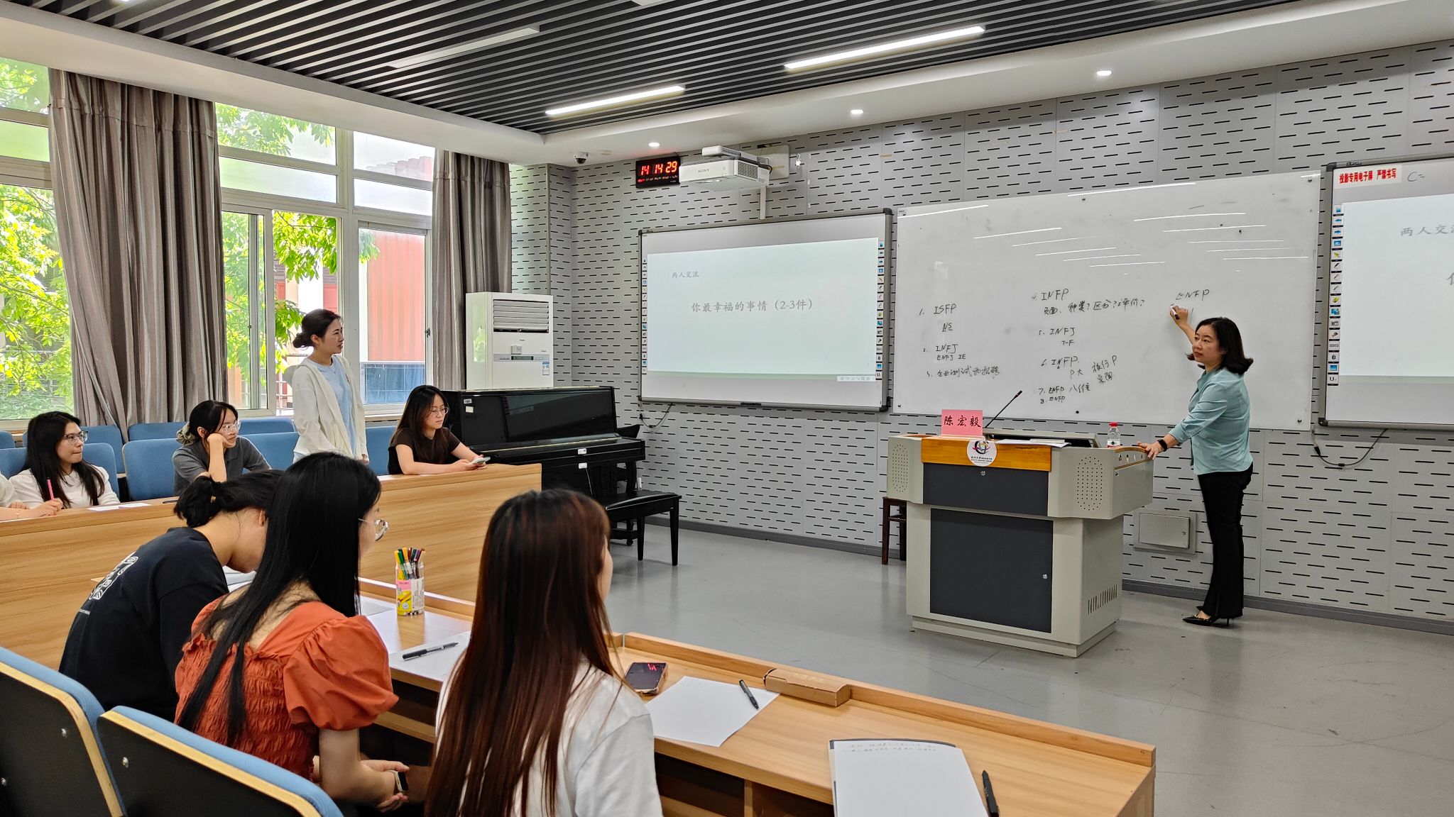 讲座以“两人交流:你最幸福的事情”轻松开场,同学们纷纷分享生活中那些闪光的幸福瞬间:有人谈及在团队比赛中与队友协作夺冠的喜悦,有人回味独自完成一幅画作时的内心充实,还有人动容于收到家人手写书信的温暖细节。陈宏毅老师从这些分享中巧妙引入MBTI人格类型理论,解读道:“你们描述的幸福场景,其实暗合了人格类型的四维密码——外倾型同学的幸福多源于人际互动,内倾型同学更享受独处时的心灵共振;感觉型同学擅长捕捉具体细节,直觉型同学则倾向于挖掘抽象意义。”