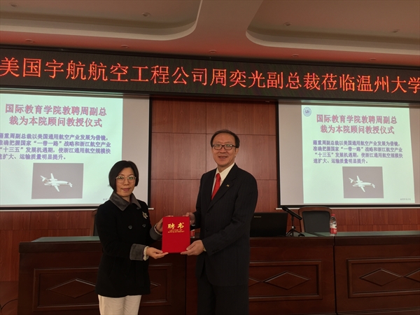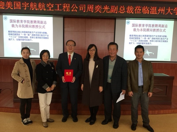 聘任美国宇航航空工程公司周奕光副总裁为顾问教授。聘任仪式由院长叶苗教授主持,叶院长代表学院向周副总裁颁发顾问教授聘书,对周副总裁的莅临指导表示热烈欢迎。