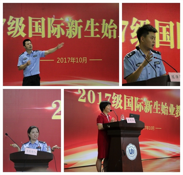 茶山派出所陈沛豪、周陈怡人两位警官分别为国际学生作交通、人身和财产安全方面专题辅导,市公安局出入境管理局欧阳超警官作国际学生签证、居留许可办理相关知识专题讲座。校图书馆吴凤仙老师带领国际学生参观了育英图书馆并作入馆教育。留管部教学科姚华、学生科陈康豪、周颖三位老师分别为国际学生重点解读了教务工作、学生管理规定、奖学金制度等内容。国际学生干部Michael、Natalie向新生们介绍了国际学生联合会组织结构和职能,希望他们积极参与国际学生联合会,搭建起学校与学生之间的沟通桥梁,更好地为学校和学生服务。