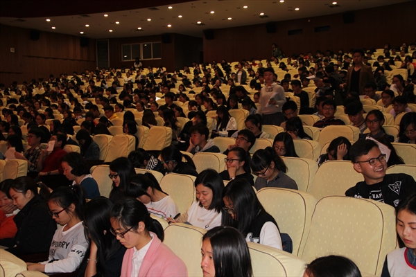 大学生活动中心育英大礼堂专为修读《大学外语》课程的大一、大二学生举行了英语学习分享会,旨在推进大学外语教学国际化、加强学生的国际化学习意识、提升学生的自我认知能力。分享会得到了校团委、外事处、保卫处和机电学院等单位的大力支持与配合,外国语学院毛继光院长、陈孟森书记、朱晓申副院长、外教George Main和全体大学英语教师以及15级研究生参加了分享会。外事处叶苗处长,国际合作学院包含丽副院长、英语教练刘书云老师以及外教Ely等也出席了分享会。分享会由外国语学院金瑶同学主持。