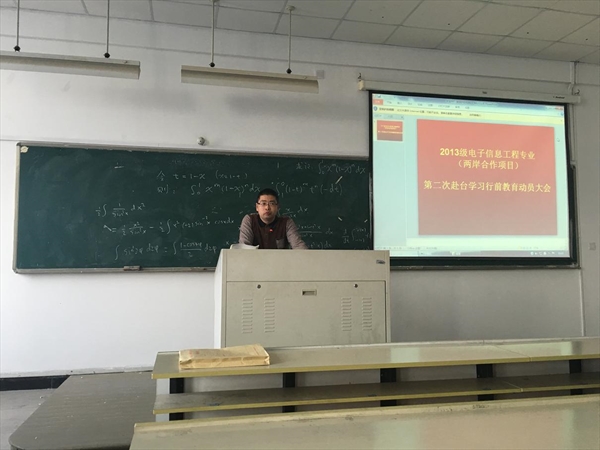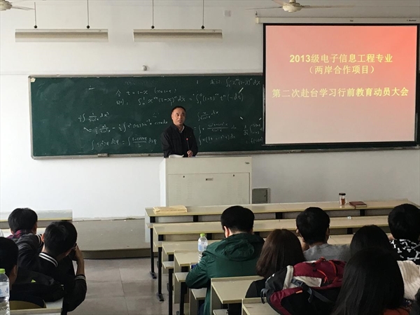 2016年3月7日下午15:00,国际合作学院2013级电子信息工程专业(两岸合作项目)学生第二次赴台学习行前教育动员大会在北校3号楼402举行,电子信息工程专业负责人、上学期赴台带队老师、本学期赴台带队老师、班主任、教学科、学生科相关老师等出席会议,党总支书记朱建平主持会议。此次是2013级电子信息工程专业学生第二次赴台学习交流,共有92名学生、2位带队老师赴台湾开展为期半年的学习交流活动。上学期赴台带队老师陈煜和王峰对上个学期学生在台学习的情况进行了总结,对学生本学期的学习提出了希望和要求。陈煜老师从学生管理的角度,提醒每位同学要服从双方学校的安排,随时保持与带队老师的联系,在保证安全的前提下,力求学业更加进步,同时希望每位同学多参加台湾中华大学的各种活动,通过相互学习交流,进一步开拓自己的视野,增长知识。王峰老师从学业学习的角度,希望各位同学能顺利完成在台湾中华大学的课程学习任务,及时配合导师做好毕业论文(设计)的规划和设计,充分利用台湾中华大学的平台,积极参加中华大学组织的各类学生学业竞赛,进一步提升自己的实践动手能力。