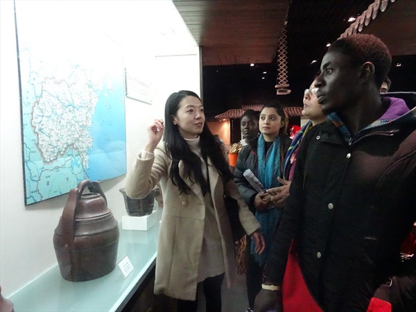 民俗博物馆。在体验民俗文化和传统特色的过程中,留学生新生开始了第一堂实践观摩课的学习,借助图