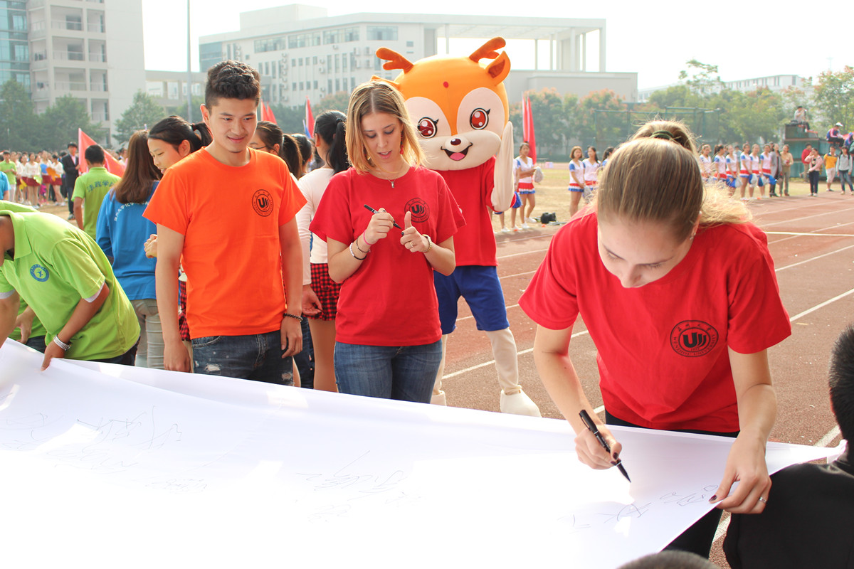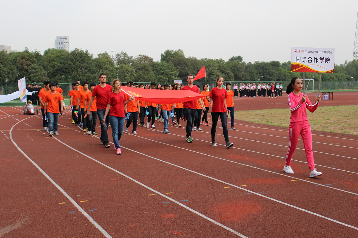 运动会拉开帷幕,国际合作学院的方阵由来自荷兰、意大利、俄罗斯的四位留学生担当旗手,经过主席台时,方阵的同学们迈着整齐的步伐,挥动各国小彩旗,高喊“国合国合、强强联合、国际合作、视野开阔”的口号,充分展示了学院团结拼搏的精神风采和走向国际的办学特色,由此开启了国际合作学院在运动场上精彩的三天。
