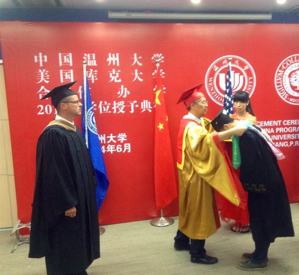在严晓鹏院长宣布了2014届毕业生学业优秀奖获奖名单和生涯规划暨体验教育优秀奖获奖名单后,隆重而温馨的学位授予典礼正式开始。双方校领导分别为一一上台的45位美国库克大学管理学学士学位获得者颁发证书、拨穗,并为优秀学业奖获得者、优秀生涯规划暨体验教育奖获得者授予绶带。看着穿着学士服的子女手捧学位证书与中美两校校长合影,参加典礼的家长无不动容,他们的付出与期盼终于在此时化为现实。