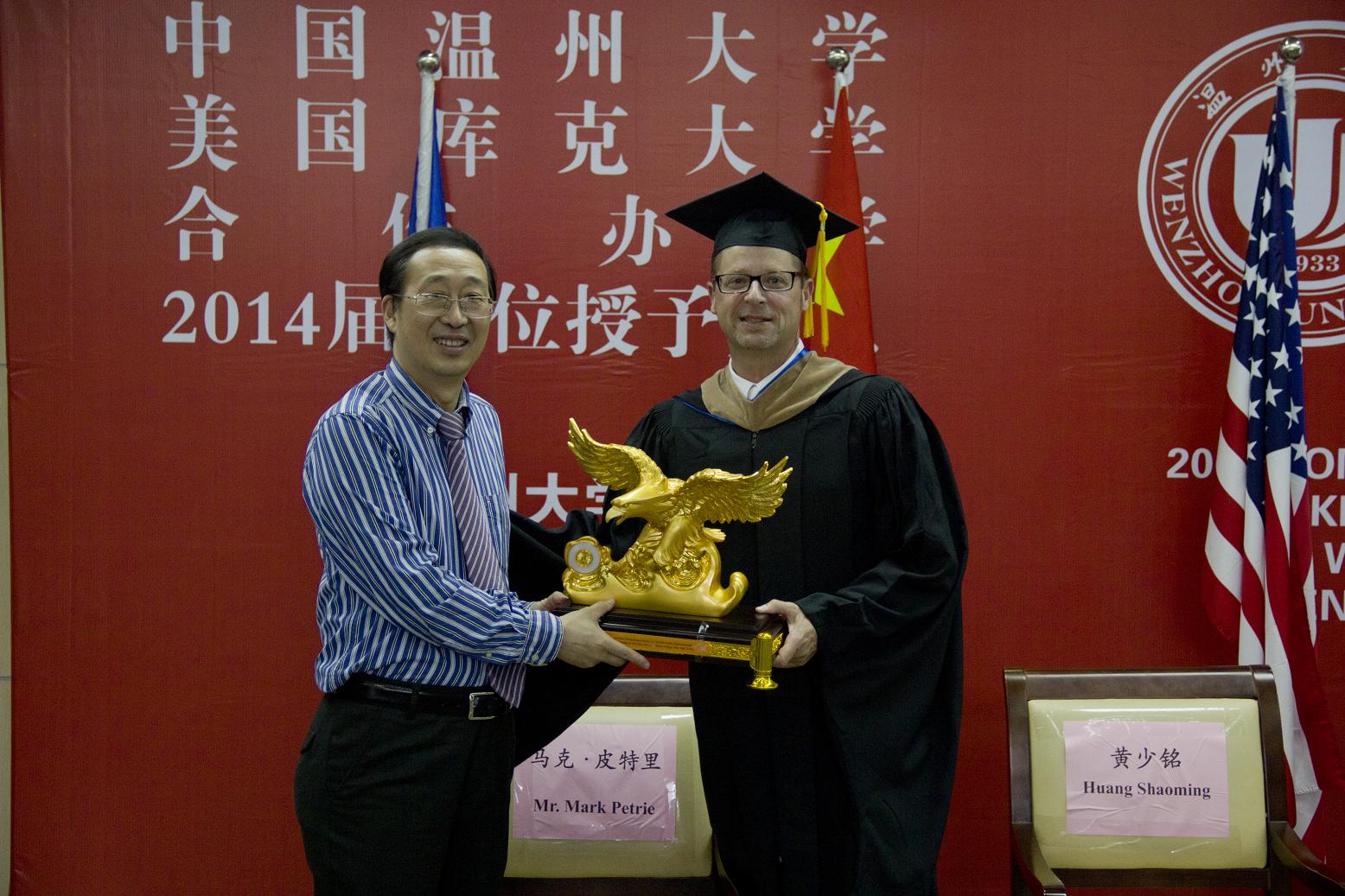 国际合作学院院长严晓鹏博士和原天津科技大学国际学院院长张建国教授颁发了“库克大学国际教育杰出成就金鹰奖”。马克·皮特里副校长在致辞中指出毕业典礼是大学生活中最重要的一天。它代表了一个结束,一个开始,以及一段延续,毕业生们已经学习到了必要的技能和知识去面对将来的挑战和经历,新的世界正在展开, 随着机会而来的是更多的责任,希望毕业生们能善用库克的学位和努力付出获得的知识、经验和才能,为社会,家人,国家以及整个世界做出贡献。