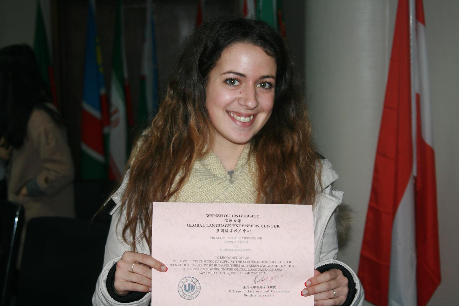 国际文化交流社社长-刘儒儒,代表社团与多国语言推广中心向参与授课的来华留学志愿者们颁发了感谢状;上课的同学们也纷纷送上了自己的礼品。此外,在典礼过程中,师生们分组讨论并依次分享了对课程的思考与建议;“课程期间应该能举办一些节目,让各国语言交流互动,深入对比”,这是一位法语学生的提议,并受到一致认可,充分体现了大家日趋关注文化的交融。最后,在各国文化的碰撞中,师生们热切交流、交换学习心得,并在所学语种国的国旗旁拍照留念,为本学期的语言学习画上了完美的句号。