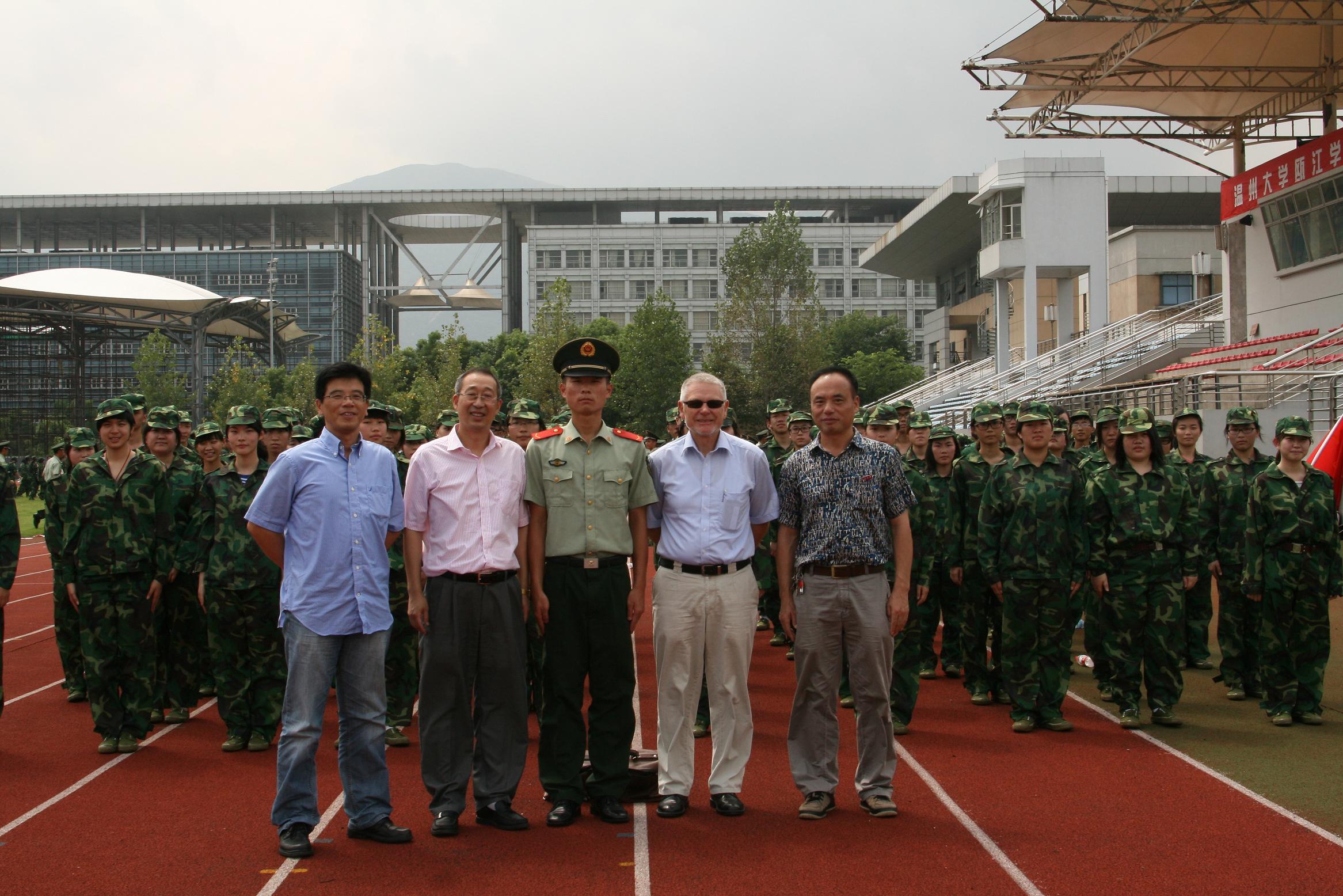 910日上午,军训开营仪式一结束,学院院长严晓鹏、党总支书记朱建平、副院长陈军以及中丹项目主管Jorgen Dalhoff来到北校区田径场,看望教官和军训学生。