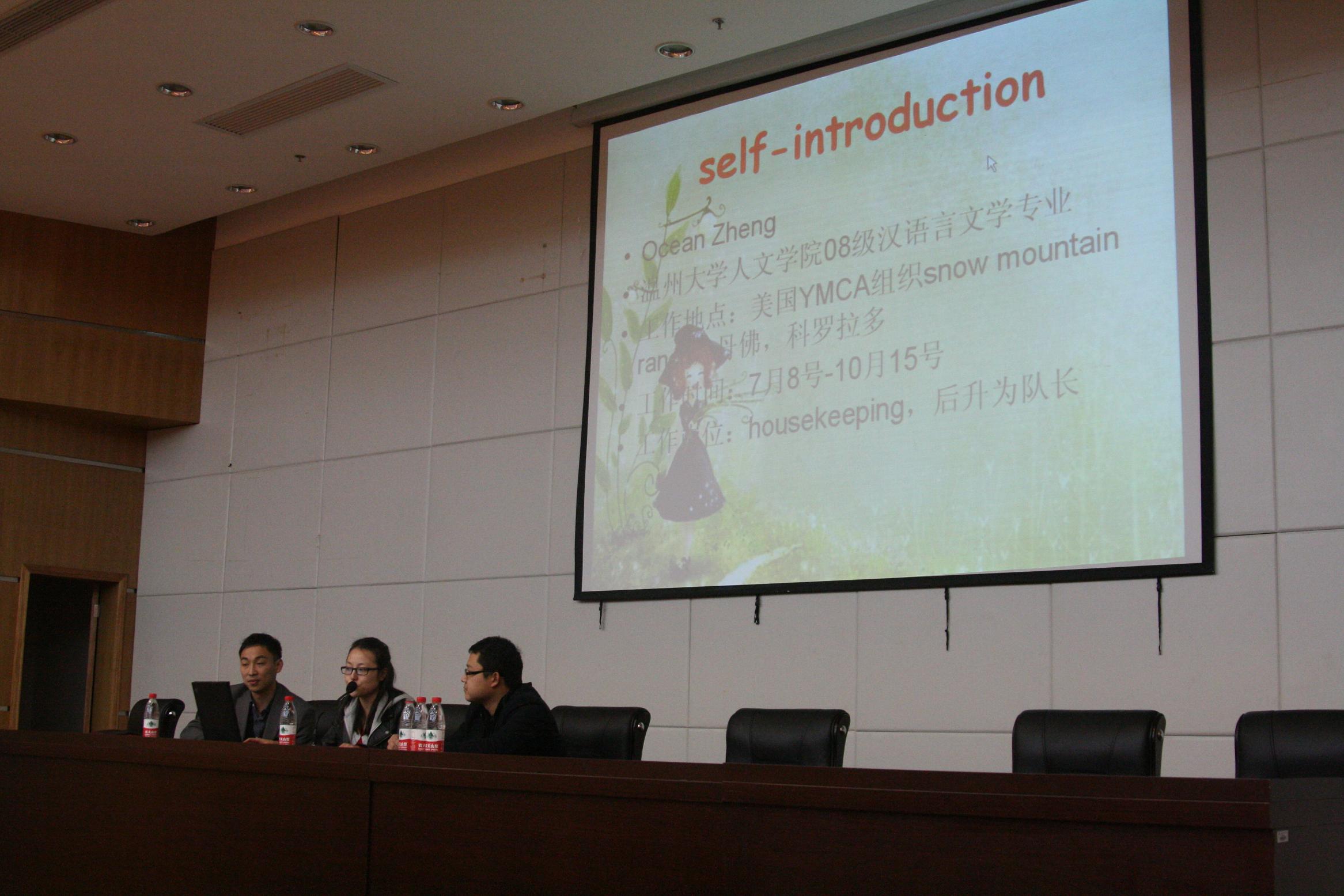 近日,555电影 在南校区育英图书馆报告厅举行了555电影 2012暑期赴美带薪实习项目成果报告会暨说明会。会上9名同学获得了美国实习单位颁发的奖状,同学们的工作能力得到了实习单位的肯定。薛凡等三名同学为现场的同学们详细、生动地讲解了在美国的实习工作、生活、旅游等情况并回答了同学们的提问。