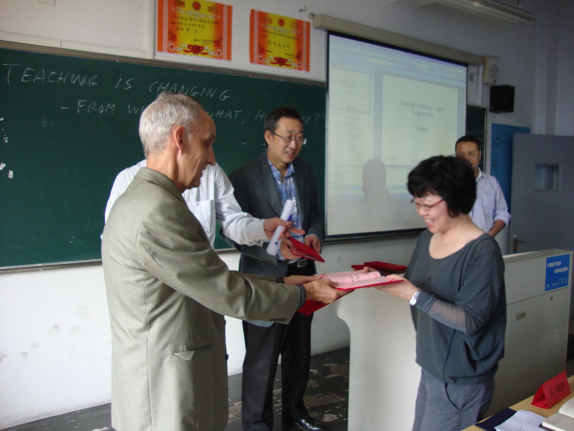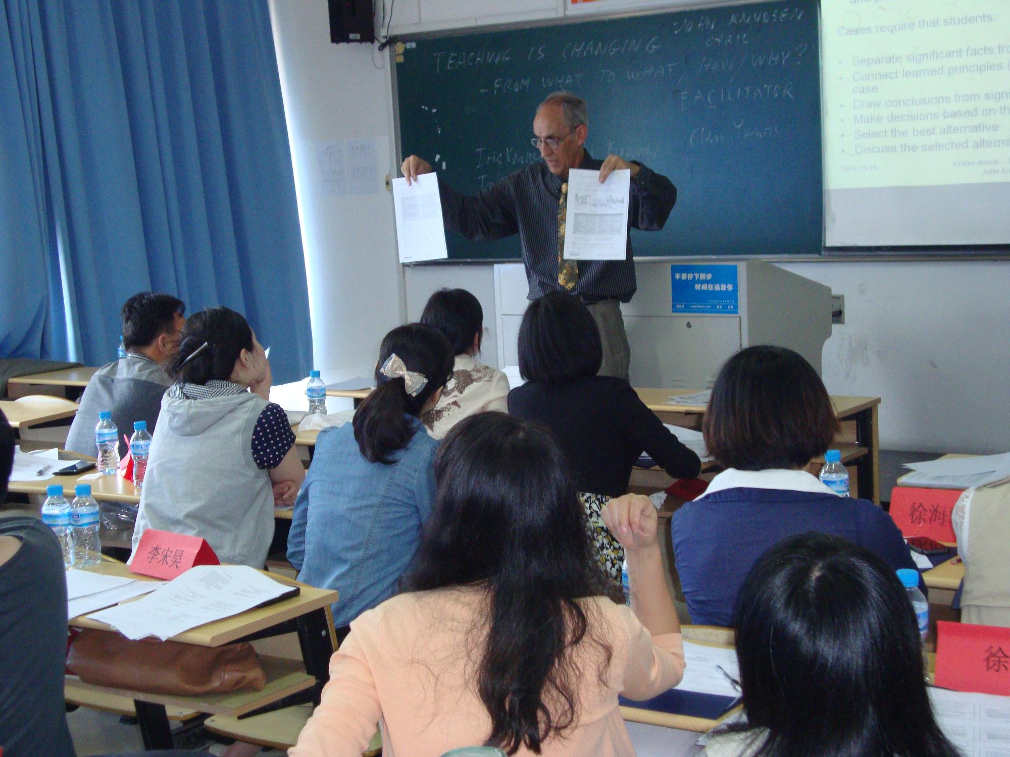 本次培训是由来自丹麦Niels Brock Copenhagen Business College资深教授JohnKnudsen主讲,培训以from “what” to“what、how、why”为切入点展开了专题业务培训,详细阐述了:1.如何创造性地使用教材、合理地整合教材、准确定位教学内容,使其更贴近学生需求。2.如何从教学关注教师的“教”转化到为关注学生的“学”。3.强调教师要处理好“想教什么”,“实际教了什么”,“学生学了什么”的三者的关系。培训内容不仅丰富充实,针对性强,而且视角新颖,使参加培训的教师在业务和思想上都受到了良好的熏陶和提升。
