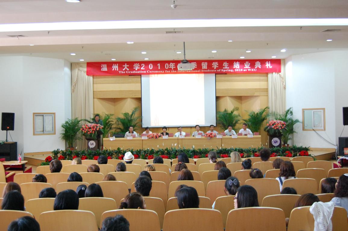 2010年春季留学生结业典礼于南校区雁山厅隆重举行。副校长薛伟教授出席。外事处、教务处、学生处、校友办公室、团委、人文学院、国际合作学院等部门学院的领导、留学生授课教师代表以及来自泰国、日本、伊朗、西班牙、意大利、荷兰、肯尼亚、南非、加拿大、俄罗斯等10个国家的50余名留学生参加了结业典礼。结业典礼由国际合作学院院长严晓鹏主持。