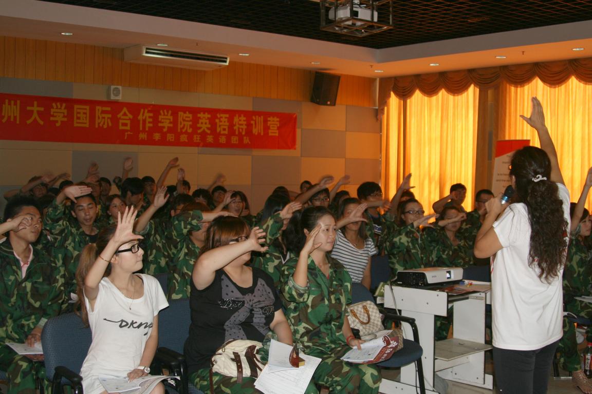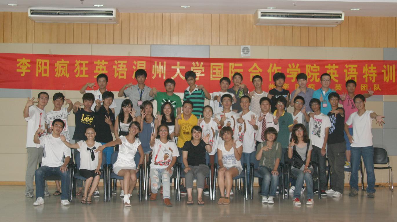 疯狂英语特训营开营。学员为2010级中美合作库克项目精品班和留学美国预科班的60多名新生。这两个项目一直以英语为办学特色,库克4年课程中有10门核心课程由美国库克大学直接派外教来温大授课,学院专门聘请了口语外教,还定期组织学生与留学生一起参加各种活动,以提高英语水平。上学期,学院聘请了环球雅思的专业老师为07和09级学生辅导,效果显著。这次聘请疯狂英语团队做特训营,激发学生学习英语的热情也是学院的一个新尝试。