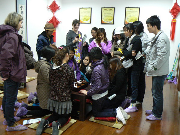 校团委陈琪老师和555电影 刘建东老师带领学生参观了演艺厅、多功能厅、党员之家、展示厅、排练厅、素质拓展培训室、电子阅览室、棋牌室、社团之家和展览室等多个活动场所,观摩了茶艺、手工制作、书法等现场表演。留学生们还参观了大学生创业园,并与中国学生进行了交流。