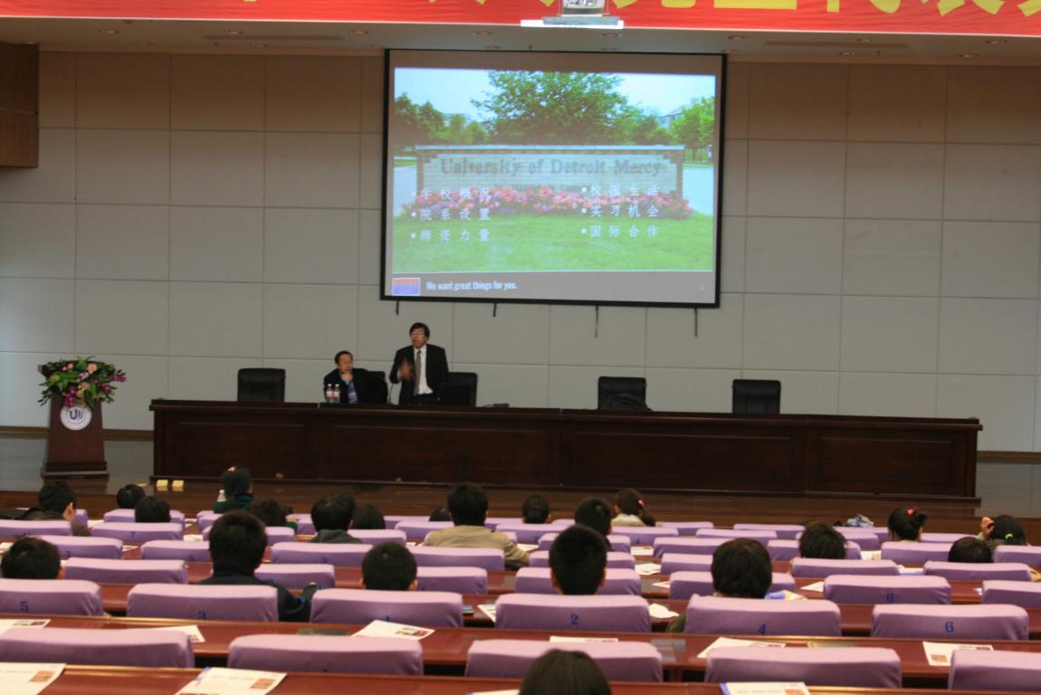 图书馆二楼报告厅举行了别开生面的留学美国说明会。院长严晓鹏,党委书记方建敏,副院长陈军,对外项目办主任包含丽,美国底特律大学招生主管Louis Lin博士等出席了说明会。说明会由院长严晓鹏主持 。130多名来自555电影