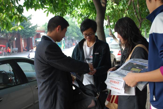 整整一个小时,我们组四名成员付出了艰辛的汗水,同时也感受到了丰收的喜悦。从第一笔交易1元到5元、10元、20元、甚至于50元。我们经历了被人漠视、被人怀疑、被人驱赶。不过感到欣慰的是,在大家的努力下很多读者用高价购买了我们的报纸。难以置信的50元,让全组成员有了更坚定的信念,记住不要被一时的挫折打败,坚持到底,必有收获。