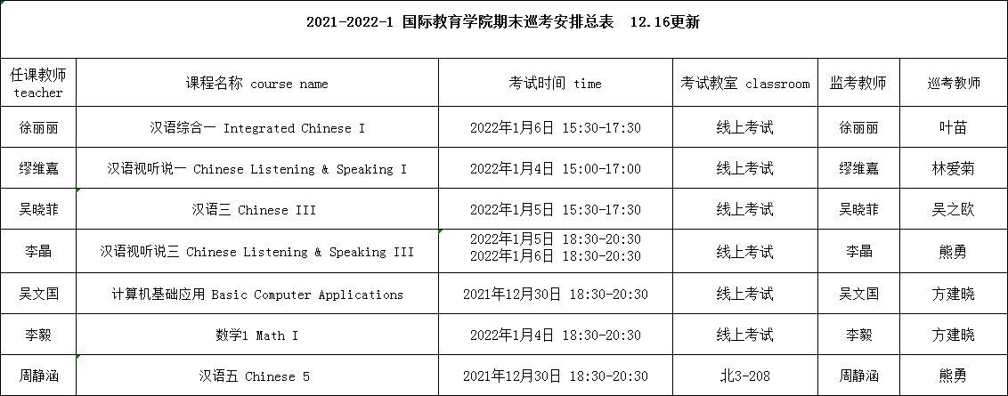 为严肃考风考纪,保证考试工作的顺利进行,根据学校要求,555电影 组织学院领导对期末考试进行巡查,巡考工作安排表如下: