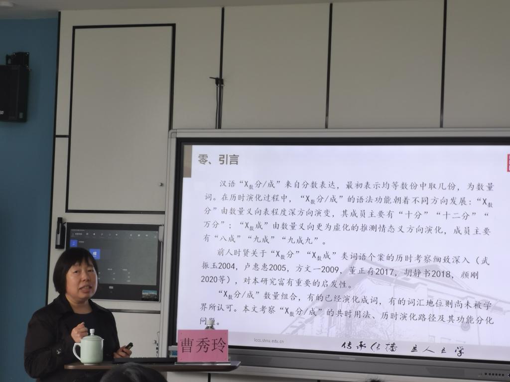 曹教授从自身的汉语国际教学实践经验出发,与在座师生分享了汉语数词来源副词的独特语法表现。她采用共时和历时相结合的研究思路,在共时用法描写基础上,勾勒“X数分”和“X数成”两个系列词语的功能格局,深入探讨了该格局的实现机制,同时结合其他语言相关现象,提出汉语从数量到情态表达不仅具有人类语言的共性,也具有汉语的独有特征,为汉语国际教学提供了新的教学理论与方法。