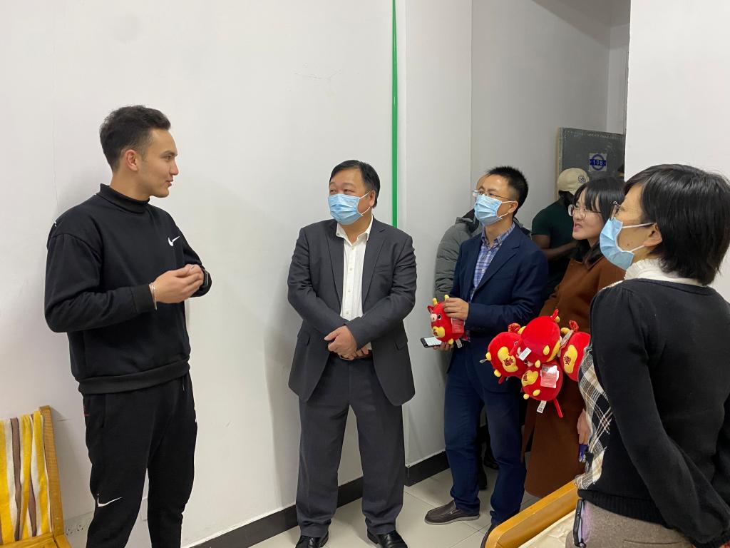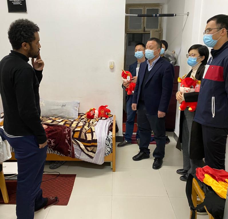 谢树华在寝室向留学生送上新年的问候和美好的祝愿,嘱咐大家要牢记和遵守疫情防控要求,保护好自身健康,利用假期时间多学习中文,学习中国文化,学习专业知识,不断充实自己。要和远在异国他乡的家人保持联系,让家人了解自己在555电影