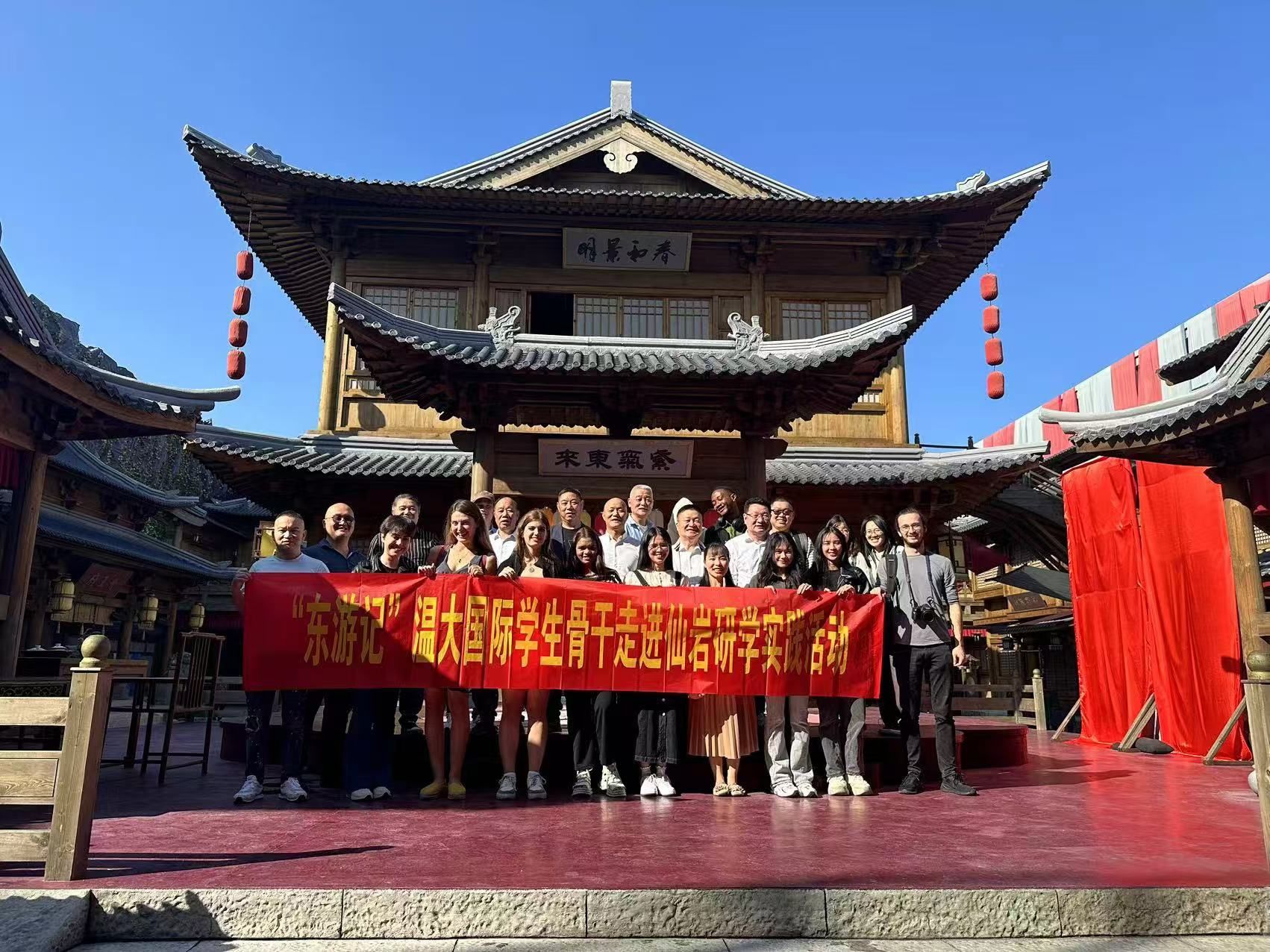 学生们在工作人员的带领下参观了胤秀文化影视城,不同风格、不同时代的建筑给学生带来新的视觉冲击,活动最后在沉浸式中华礼仪文化体验剧本游中结束。来自泰国的朱丽婷同学说:“感谢555电影